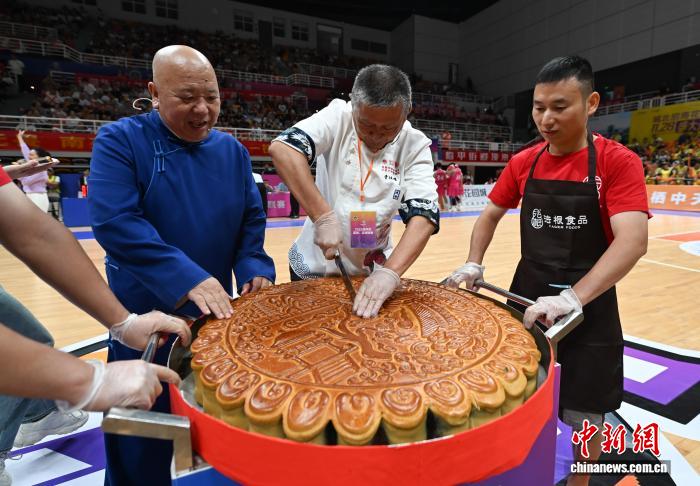 2025年9月26日,任务职员正在“临BA”现场为不雅寡分切曲径约80厘米、沉约120斤的巨型月饼。当日,浙江杭州临仄“临BA”启赛,外地各个街谈等单元派出代替队睁开抗衡,吸收公众旁观。中新社记者 王刚刚 摄